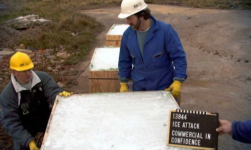 The photograph shows sections of a surrogate iceberg target being prepared for a test firing. The associated attack system was designed to emplace a grapple hook and steel hawser deep into the body of the target.