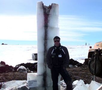 The photograph shows a sectioned surrogate iceberg target after attack by a specially optimised 100mm calibre shaped charge. The associated attack system was designed to emplace a grapple hook and steel hawser deep into the body of the target.