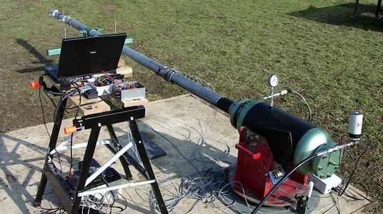 The photograph shows the DeltaLauncher nitrogen gas gun set up to detect and record the displacement and strain response of an electronic fuze payload under varying launch and terminal engagement conditions.