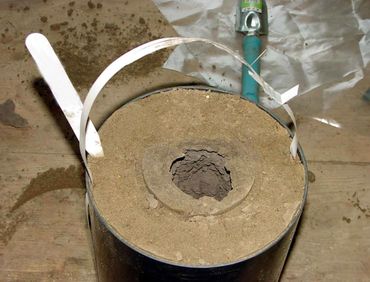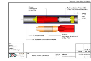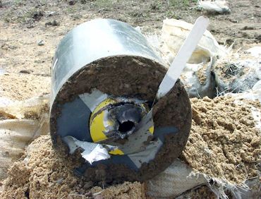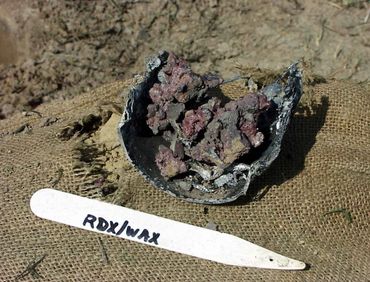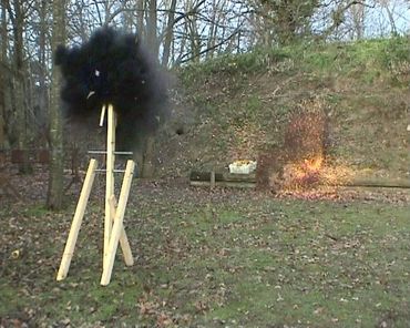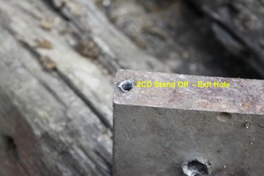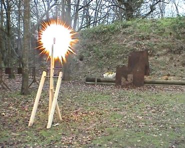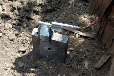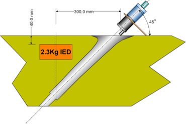 An inert IED has been buried in a surrogate test target. The Go4 system consists of a primary hole-boring charge and a secondary soft lifting charge. When the primary charge is fired, it bores an access hole under the IED, triggers a 3 second delay fuse in the secondary charge and drives it into the borehole under the IED. In the video, after the 3 second delay, you will see the secondary charge fire (white puff of smoke) and eject the IED; that lands just behind the target bay.