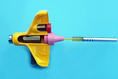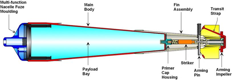 The photograph shows a sectioned view of the Multi-function Nacelle moulding fitted with an inertial impact fuze. The inertial striker is secured by the black cross-pin that is retained by an inertial latch for safe handling. When the projectile is fired the latch sets back and releases the cross-pin so it bore-rides until it can be ejected by the spring when the round leaves the barrel. This provides a short arming distance to both protect the launcher and allow engagement of experimental targets at ranges of less than 50m.